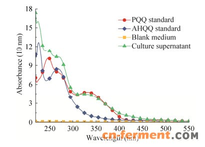 2 结果与分析2.1 PQQ高产菌快速筛选方法的建立PQQ是以pqqA编码的含有谷氨酸和酪氨酸残基多肽链PqqA为前体,经PqqB、PqqE和PqqD等酶的缩合、氧化和异构形成中间产物AHQQ,然后在PqqC的作用下通过3分子O2参与进行8个电子的氧化及环化形成PQQ。因此,AHQQ是摇瓶培养过程中最主要的代谢副产物[15, 25]。全波谱扫描表明,筛选培养基没有任何明显的吸收峰,AHQQ在275 nm处有较强的吸收峰,FJNU-6培养液上清含有AHQQ和蛋白质多肽等代谢副产物,但仍具有254 nm和330 nm两个PQQ特征吸收峰(图 1)。光谱法是一种精密度较高的PQQ发酵液快速检测方法,其准确度受培养基组分干扰[26]。分别用HPLC法和光谱法(OD254与OD330)测定FJNU-6培养过程中PQQ含量的变化,培养液中的PQQ含量与254 nm和330 nm处的吸光值呈正相关,且相关系数均高于R2 > 0.999。培养液在330 nm处的吸光值受培养过程中产生的中间代谢产物影响较小,且组内和组间精度偏差均小于2%。因此,选择330 nm作为酶标仪的筛选波长(CPQQ=35.40×OD330+0.844 4,R2=0.999 5)。