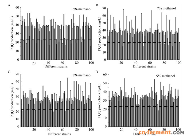 将经过5、6、7和8轮驯化的菌液稀释涂布于4%甲醇平板,各挑取100个单菌落进行快速筛选,结果如图 3所示。从图中可以看出,随着驯化轮次的增加,突变株的PQQ平均含量和最高产量也呈现出先升后降的现象,进一步表明驯化过程中甲醇的浓度并非越高越好,高甲醇浓度的确会降低PQQ的产量。