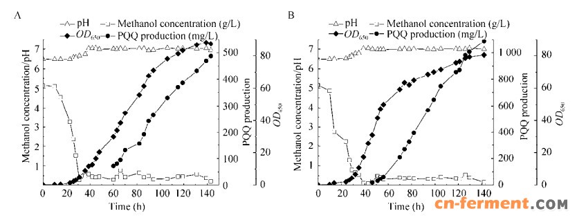 1.4 分批发酵验证高产菌株产PQQ性能采用二级培养模式分批培养出发株FJNU-6和突变株FJNU-R8,按10% (V/V)接种量,将种子液接入初始装有3 L发酵培养基的玻璃罐,30 ℃培养143 h。初始甲醇浓度为5 g/L,然后控制在0.5 g/L左右;通气量:2.4–3 L/min;罐压:0.05 MPa;pH:对数生长期前6.2–6.5,之后调节为7.0;搅拌转数关联溶氧,控制在40%。