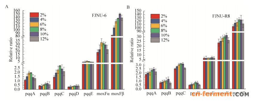 | 图 6 不同甲醇浓度下pqq和moxF基因簇的表达Fig. 6 Gene expression of moxF and pqq gene cluster under different methanol. |