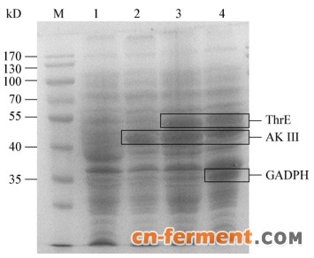 | 图 5 E. coli THR中表达lysCfbr、thrE和gapC的SDS-PAGE电泳检测图Figure 5 Analysis of lysCfbr, thrE and gapC expression in E. coli THR by SDS-PAGE gel electrophoresisNote: M: Protein ladder; 1: E. coli THR/pEC-XK99E; 2: E. coli THR/pEC-XK99E-lysCfbr; 3: E. coli THR/pEC-XK99ElysCfbrthrE; 4: E. coli THR/pEC-XK99E-lysCfbrthrEgapC. |