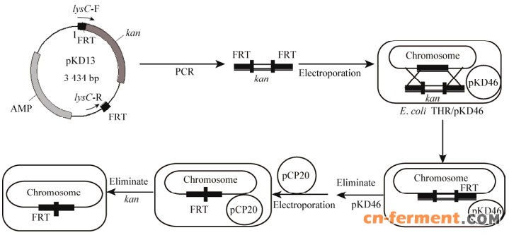 | 图 1 敲除lysC基因流程Figure 1 Flow chart of making lysC knock-out |