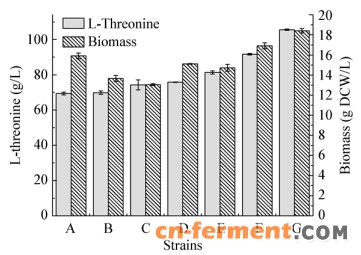 | 图 7 基因改造对苏氨酸发酵的影响Figure 7 Effect of genetic modification on threonine fermentationNote: A: E. coli THR; B: E. coli THR1; C: E. coli THR2; D: E. coli THR3; E: E. coli THR4; F: E. coli THR5; G: E. coli THR6. |