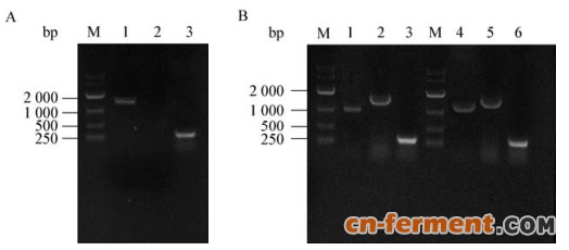 | 图 2 PCR验证lysC基因的敲除(A)以及验证pfkB和sstT基因的敲除(B)Figure 2 Confirmation of lysC, pfkB and sstT deletion in E. coli THRNote: M: DL10000 DNA marker. A: 1: E. coli THR genomic DNA (1 350 bp); 2: E. coli THRΔlysC::kan (No band); 3: E. coli THRΔlysC(254 bp). B: 1: E. coli THR1 genomic DNA (1 090 bp); 2: E. coli THRΔlysCΔpfkB::kan (1 503 bp); 3: E. coli THRΔlysCΔpfkB (260 bp); 4: E. coli THR2 genomic DNA (1 415 bp); 5: E. coli THRΔlysCΔpfkBΔsstT::kan(1 513 bp); 6: E. coli THRΔlysCΔpfkBΔsstT (255 bp). |
