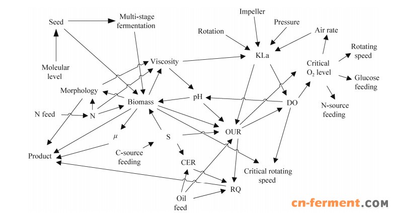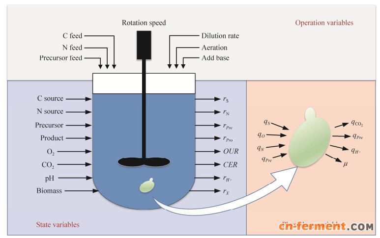 | 图 1 发酵过程中操作参数、状态参数及菌体生理特性参数之间的关系示意图[21]Fig. 1 Diagram showing the relationship among operating variables, state variables and microorganism physiological variables during a fermentation process[21]. |