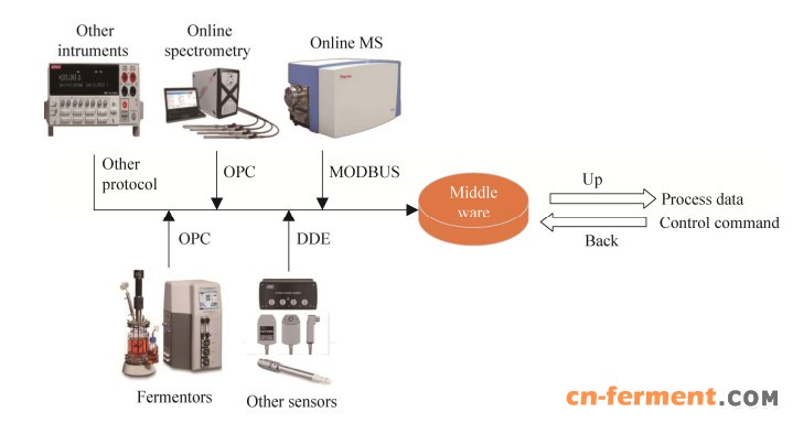 3.2 多源异质传感数据的对接与整合现场总线技术是工业自控现场(比如发酵企业中的中控室) 底层互联的通信网络,如工业以太网控制自动化技术(ether control automatic technology, EtherCAT)、控制器局域网总线(controller area network, CAN)、过程现场总线(process field bus, Profibus)、Modbus等,其中Modbus协议较为常见,该协议基于主/从应答式架构,主机发送数据请求与数据更改命令,从机收到请求并响应,实现设备双向通信。发酵企业的控制网络中存在大量不同厂商、不同驱动、不同特性的硬件设备(比如发酵罐系统、各种在线传感器、过程检测设备等),每类设备相互隔离,无法交互且难以集成,缺乏统一的接口标准。用于过程控制的OLE (OLE for process control, OPC) 标准正是针对该问题设计的工业通讯标准,基于组建对象模型(component object model, COM)/分布式组建对象模型(distributed component object model, DCOM) 技术开发,将设备驱动与通信程序封装为OPC服务器,屏蔽底层物理设备的差异,整合了Modbus等通讯协议,统一对应用客户端提供数据交互。