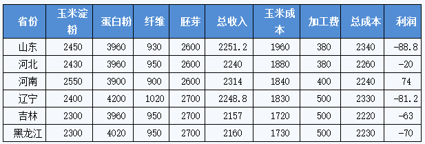 伴随着原料玉米价格高位运行,导致企业运营成本较高,深加工企业理论上仍然陷入亏损困境,据Cofeed调查显示,目前吉林深加工每生产一吨玉米淀粉理论亏损约63元/吨,辽宁深加工每生产一吨玉米淀粉理论亏损约81.2元/吨,山东深加工一吨淀粉理论亏损约88.8元/吨,如下表所示。深加工企业盈利情况依旧不佳,多数地区深加工企业仍处于亏损,鉴于原料玉米价格强势运行,为避免亏损幅度进一步扩大,厂家对玉米淀粉仍有提价意愿。