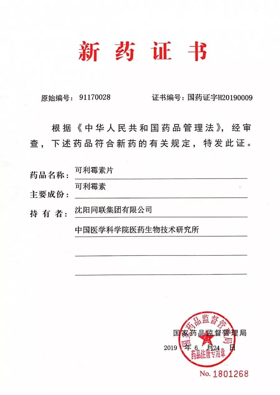 2019年6月,可利霉素作为一类新药获得国家药监局批准上市。恰逢今年是中华人民共和国成立70周年,可以说,可利霉素的面世是献给祖国的贺礼。