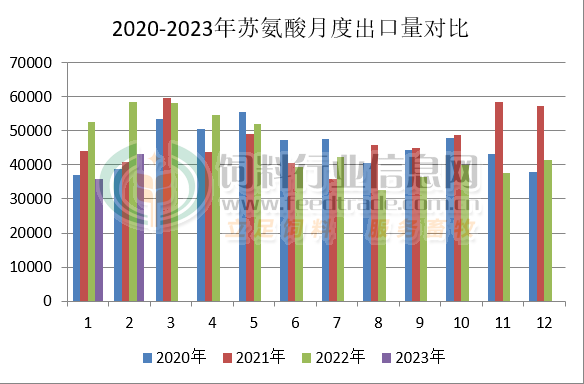 据海关数据统计,2023年1-2月,我国出口苏氨酸产品约7.9万吨,同比降幅为29%。其中1月出口量为3.6万吨,同比降31.88%,2月出口量为4.3万吨,同比降26.5%。2023年我国苏氨酸主要出口国为巴西、荷兰、俄罗斯联邦、比利时、西班牙、越南、美国、印度、印度尼西亚、泰国、菲律宾、韩国、加拿大等。