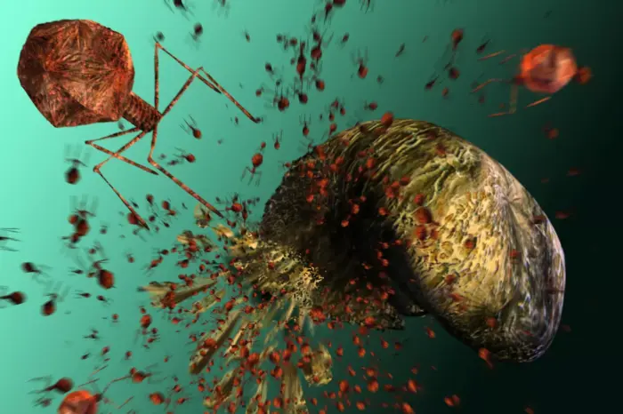 噬菌体是感染细菌的病毒。T-噬菌体由二十面体(20侧)头部组成,其包含遗传物质(DNA或RNA)和具有多个弯曲尾部纤维的粗尾部。尾部用于将遗传物质注射到宿主细胞中以感染它。噬菌体然后使用细菌的遗传机制来复制自己。当产生足够数量时,噬菌体通过裂解离开细胞,裂解是杀死细胞的过程。KARSTEN SCHNEIDER /科学图片库/盖蒂图片社